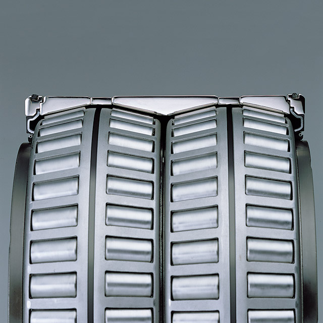 将加热的钢板用扎辊压薄的轧制工序,在动态冶金设备使用中也是具有代表性的工序,而且也是一个对最终产品的质量影响很大的重要工序。主轧辊的两端部分,主要使用四列圆锥滚子轴承。轴承使用条件,在冶金设备中也具有代表性,不仅需要耐重载荷,还要在冷却水及异物(铁粉)侵蚀的恶劣工况下使用。